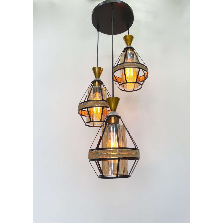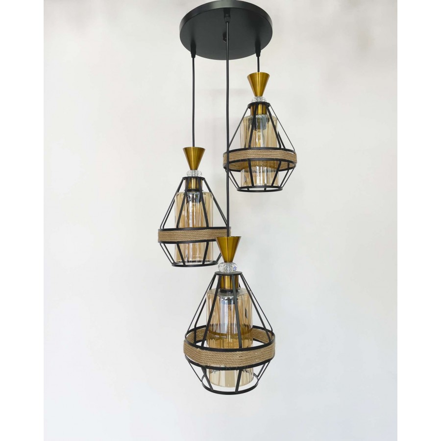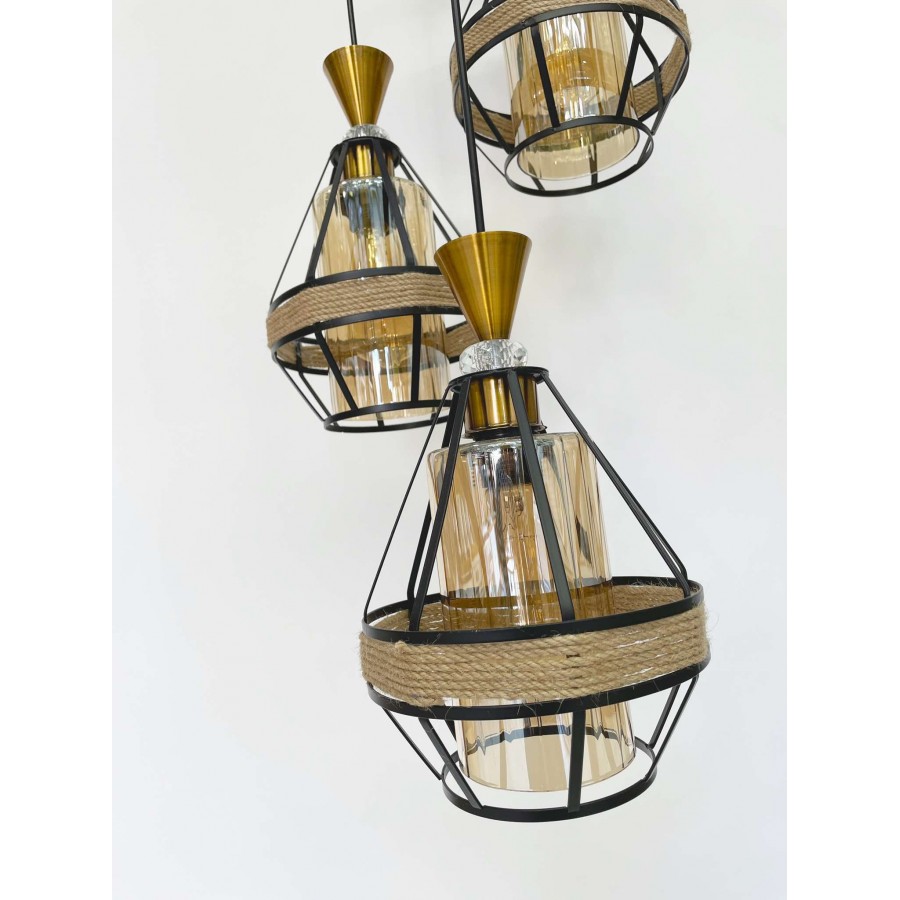 Lustre de 3 Matière métal + verre + corde Couleur noir Diamètre socle 23cm Dimension de chaque suspendue : H22cm-D15cm Hauteur...