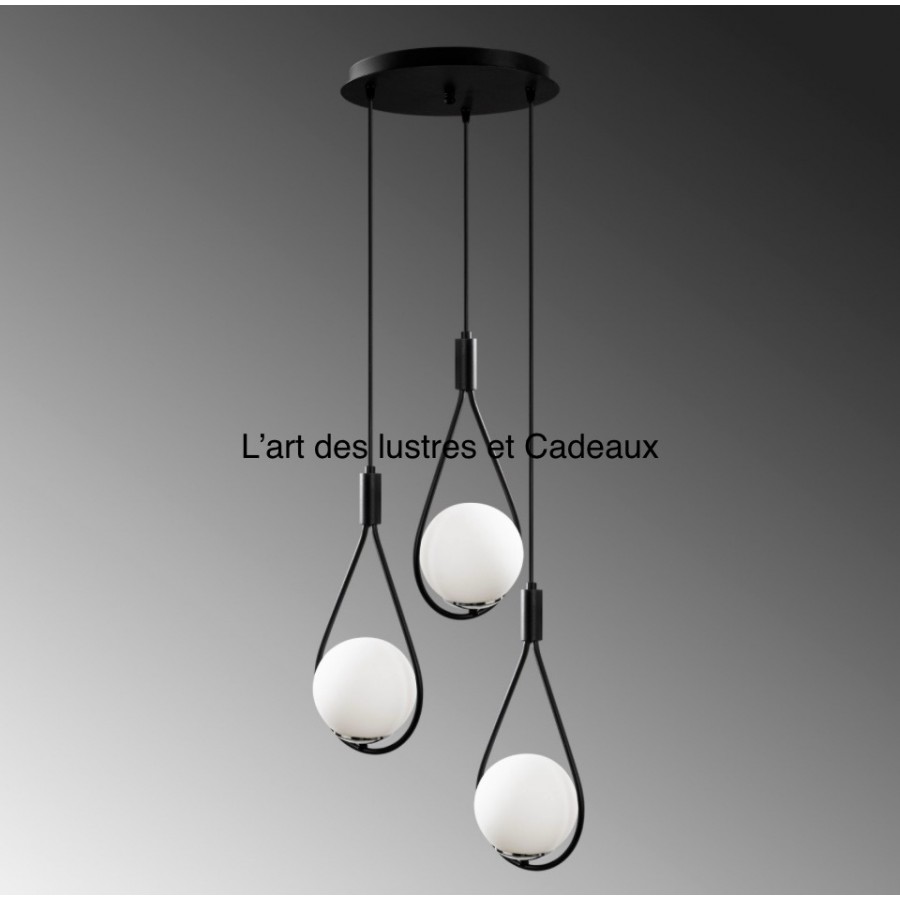 Lustre de 3 suspendue Couleur noir (DISPONIBLE DORE) Matière métal + verre Larguer socle 50cm Diamètre boule 15 cm Hauteur...