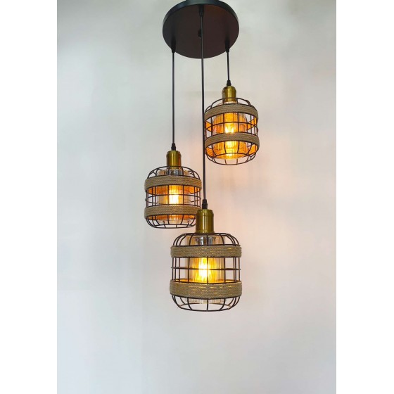 Lustre de 3 Matière métal + verre + corde Couleur noir Diamètre socle 23cm Dimension de chaque suspendue : H16cm-D25cm Hauteur...