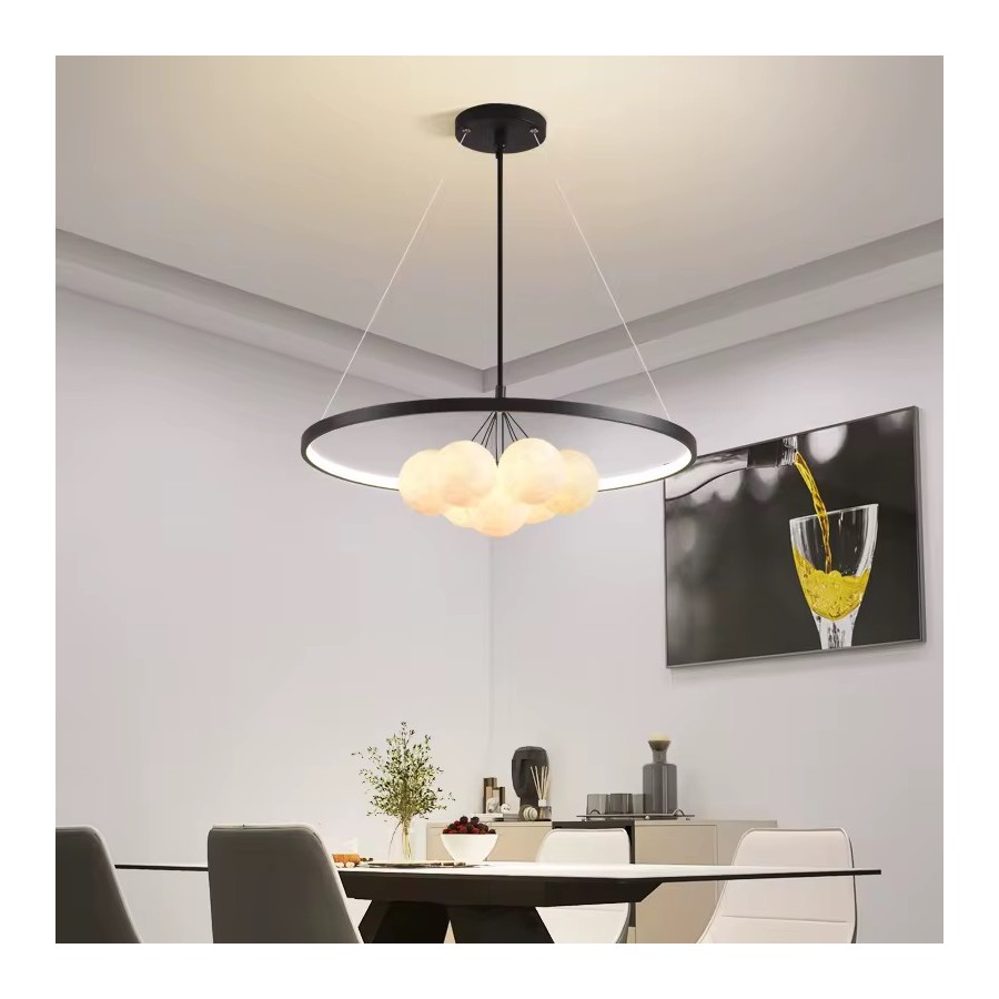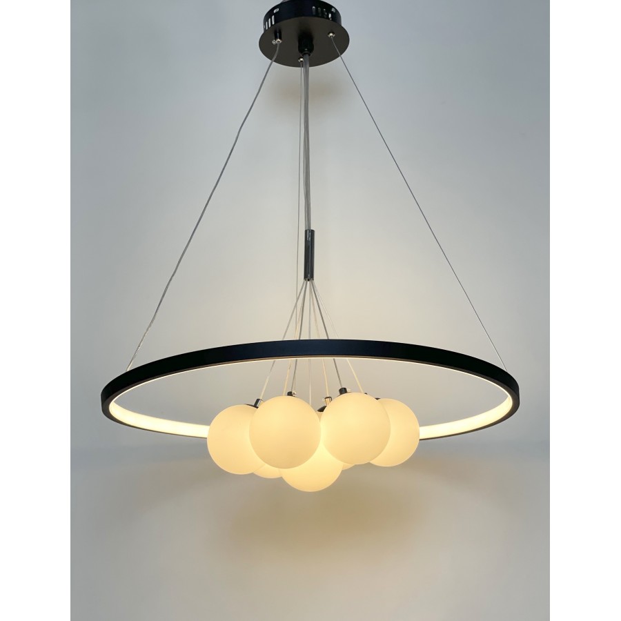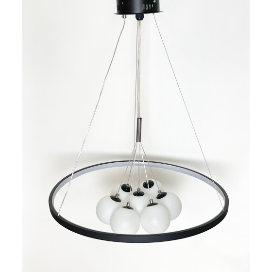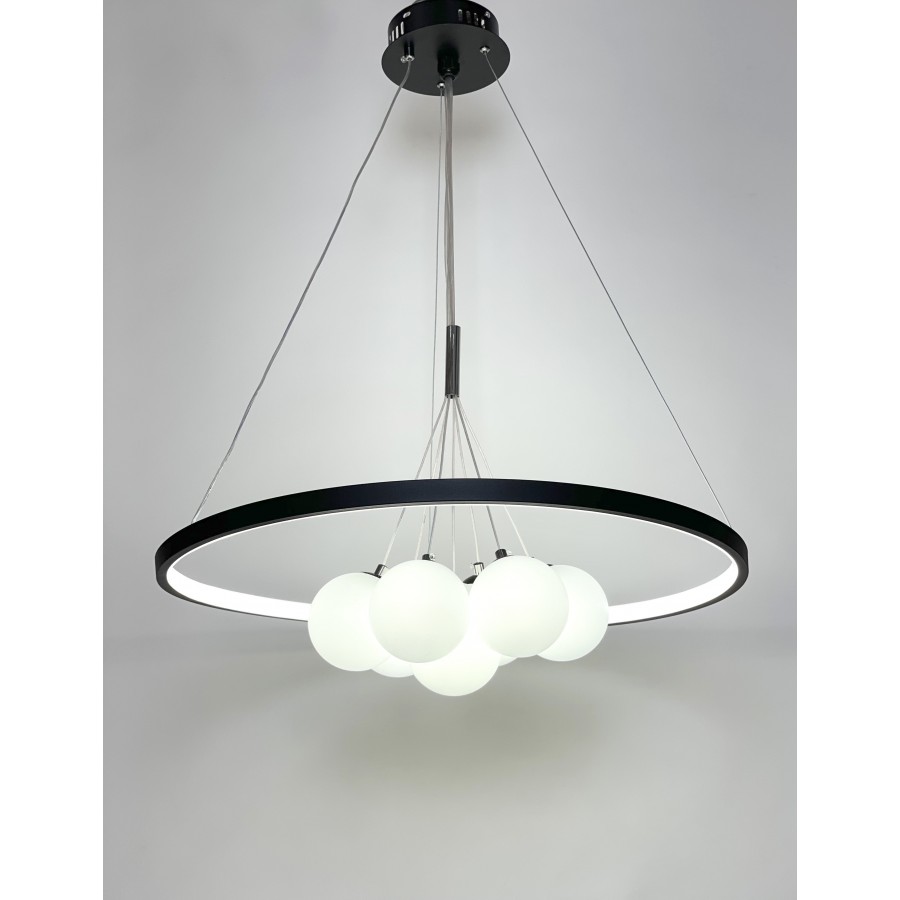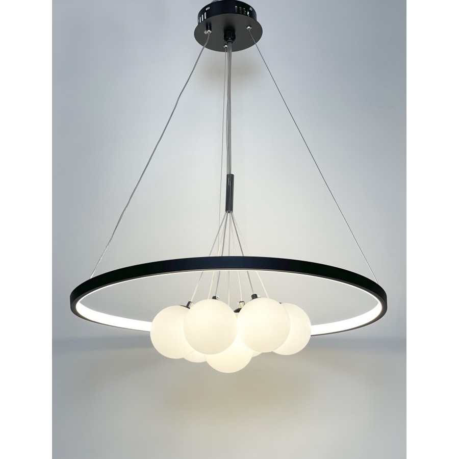 Lustre moderne Couleur noir Largeur 90cm Diamètre boule : 20cm-15cm-12cm Hauteur réglable Matière métal + verre Eclairage led...