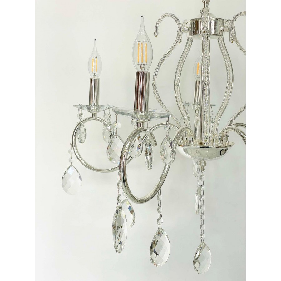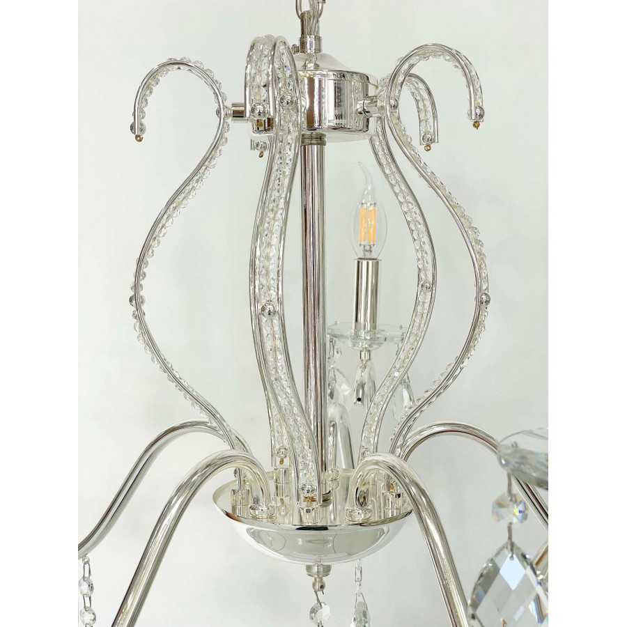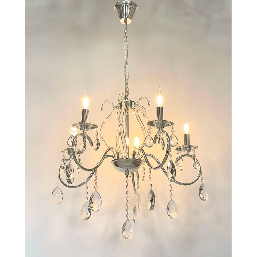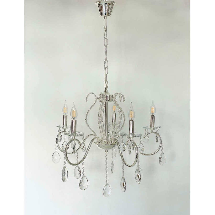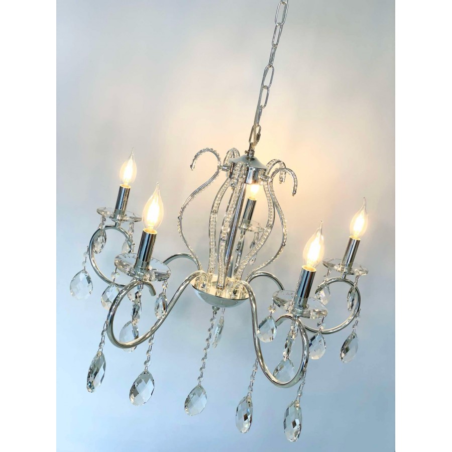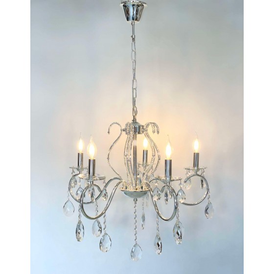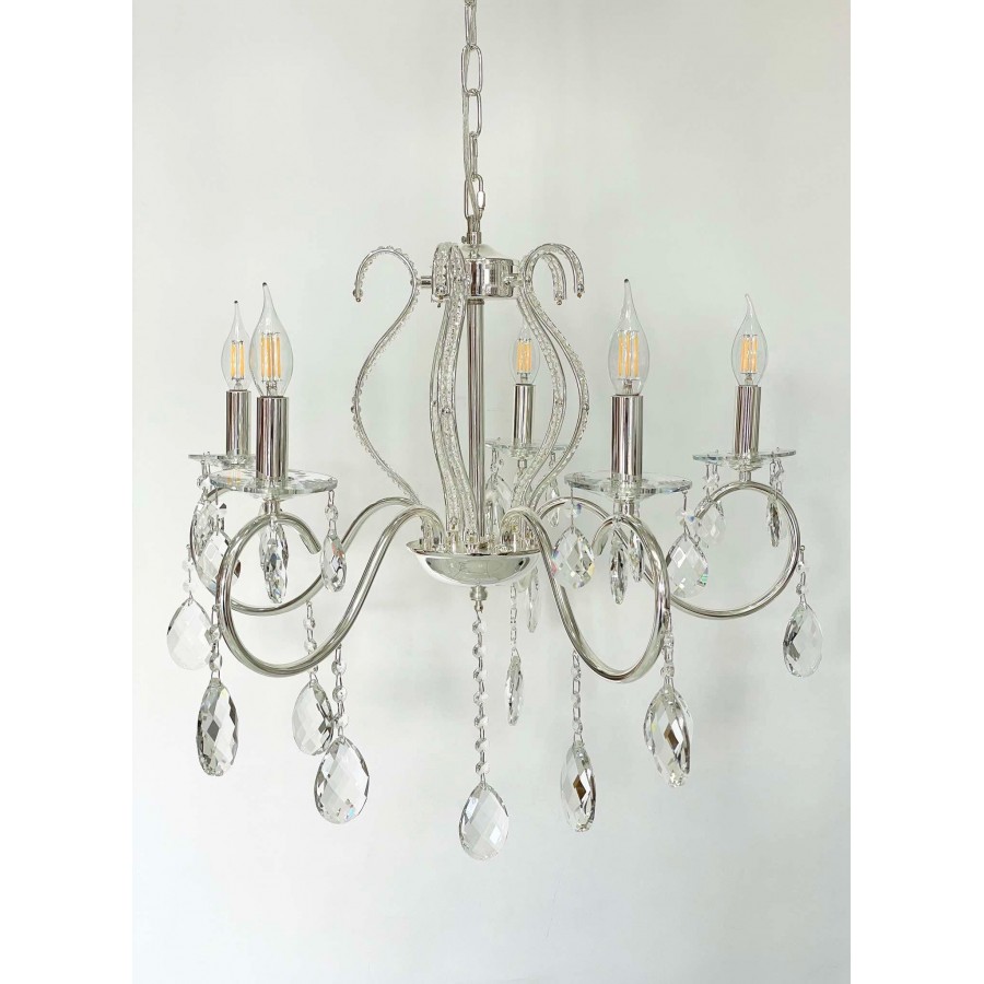 Lustre 5 branches Couleur Bronze Matière métal + cristal Diamètre 55cm Longueur 60cm Hauteur chaine réglable 5 filetage E14