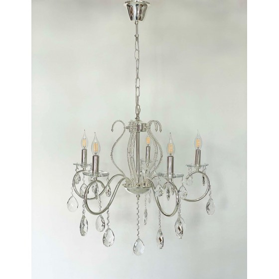 Lustre 5 branches Couleur beige patine Diamètre 60cm Longueur 60cm Matière métal + cristal Hauteur chaine réglable 5 filetage...