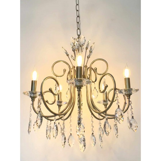 Lustre 5 branches Couleur beige patine Diamètre 60cm Longueur 60cm Matière métal + cristal Hauteur chaine réglable 5 filetage...